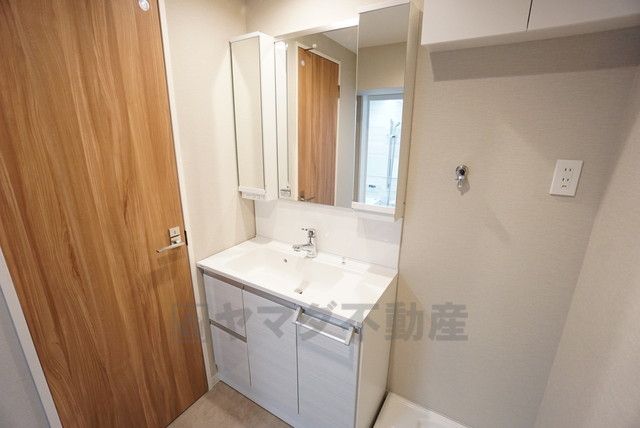 三面鏡裏収納付き洗面化粧台です^^ 歯磨きセットやスキンケア用品などの収納に便利ですね。