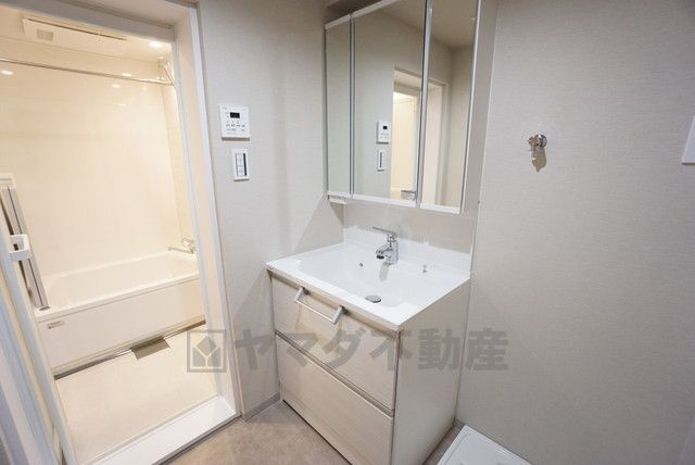 三面鏡付き洗面台。 収納も一体型になっているので、ドライヤーやヘアアイロンの置き場に困りませんね^^