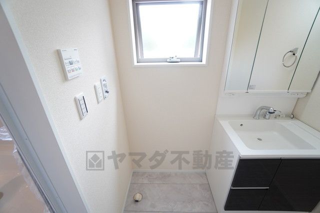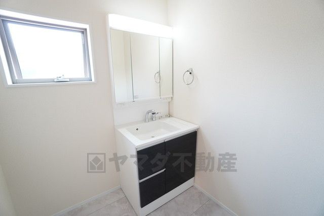 三面鏡つき洗面台。収納も一体型になっているので、ドライヤーやヘアアイロンの置き場に困りませんね^^