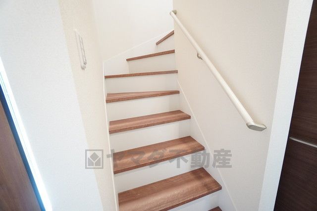 ご年配の方や小さなお子様でも安心できる、手すり付き階段です^^段差も低めで設定されてますので安全性にも優れてますね^^