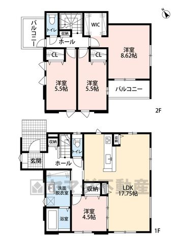 LDK17.7畳(1F)、洋4.5畳(1F)、洋8.6畳(2F)、洋5.5畳(2F) |