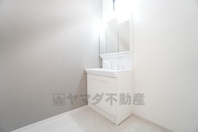 三面鏡裏収納付き洗面化粧台です^^ 歯磨きセットやスキンケア用品などの収納に便利ですね。