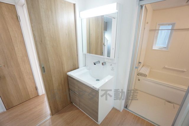 三面鏡つき洗面台。収納も一体型になっているので、化粧品や予備の歯ブラシ等もきれいに整頓できますね^^
