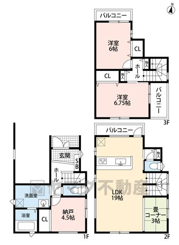 その他4.5畳(1F)、LDK19畳(2F)、和3畳(2F)、洋6.7畳(3F)、洋6畳(3F) |