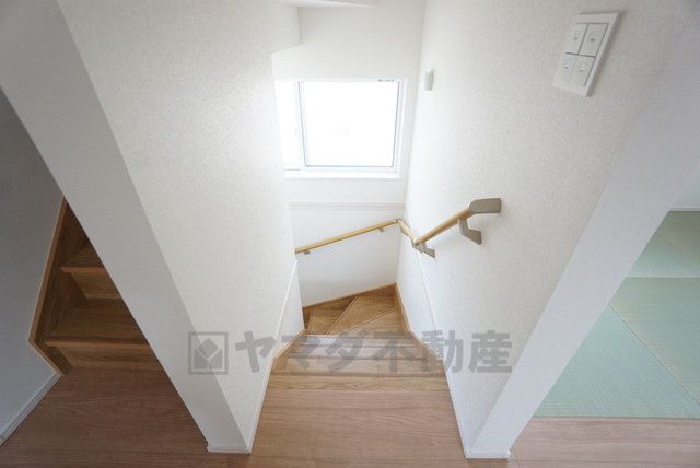 小さなお子様やご高齢の方にも配慮された手摺り付き階段です。大きな窓からは自然光がたっぷり入ります^^