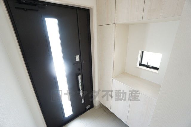 採光も考えられた明るい玄関です。たっぷり収納できるシューズBOX付きです。棚の上にお花や写真を飾っても良いですね。