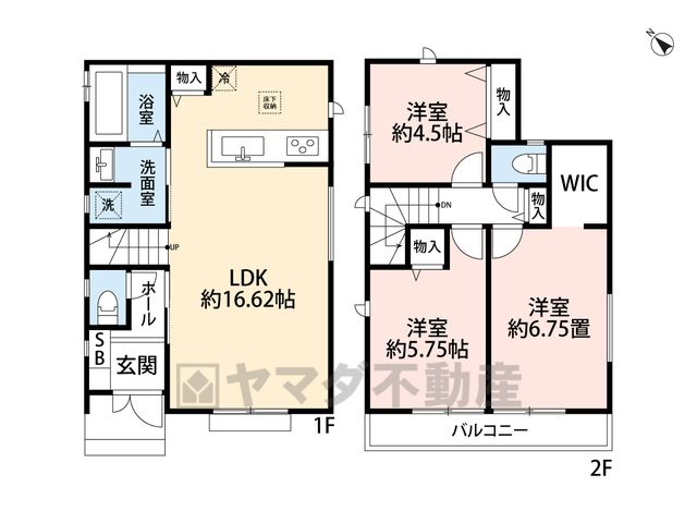 LDK16.6畳(1F)、洋6.7畳(2F)、洋5.7畳(2F)、洋4.5畳(2F) |