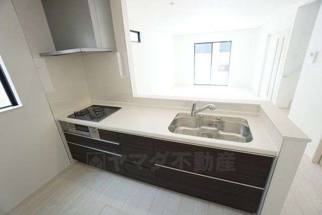 使い勝手の良いシステムキッチン。対面式キッチンからはリビングにいる家族の様子が確認できて安心です^^