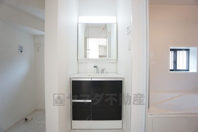 三面鏡つき洗面台。収納も一体型になっているので、化粧品や予備の歯ブラシ等もきれいに整頓できますね^^