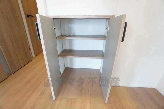 たっぷり収納できるシューズボックスです。家族全員の靴がきれいに整頓できます。棚の上にお花や写真を飾っても良いですね。