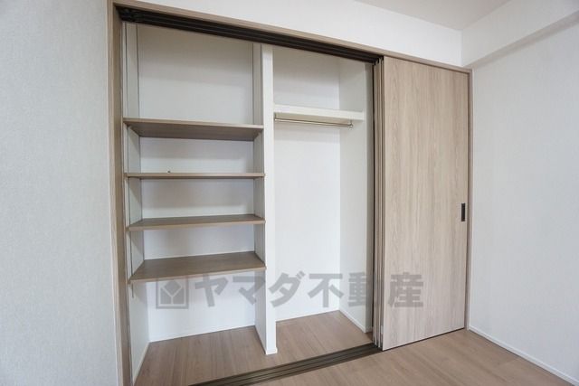 収納量たっぷりのクローゼット付です。ハンガーパイプ付で散らかりがちな洋服類もきれいに整理できます。使用頻度が少ないものは枕棚の上に、足元には3段ボックスを置いて、フル活用できるクローゼットです^^