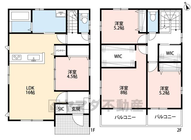 LDK16畳(1F)、洋4.5畳(1F)、洋8畳(2F)、洋5.2畳(2F) |