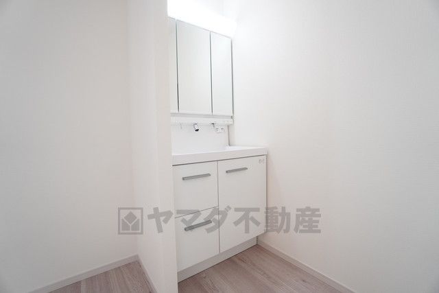 三面鏡裏収納付き洗面化粧台です^^ 歯磨きセットやスキンケア用品などの収納に便利ですね^^