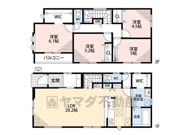LDK20.2畳(1F)、洋6.1畳(2F)、洋5.2畳(2F)、和5畳(2F)、洋4.5畳(2F) |