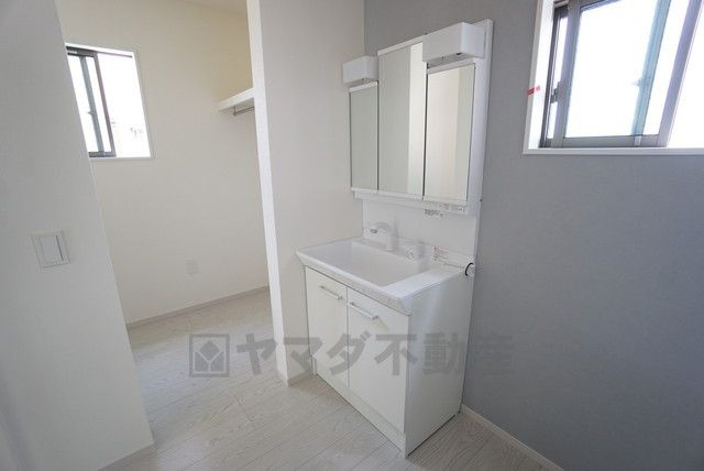 三面鏡裏収納付き洗面化粧台です^^ 歯磨きセットやスキンケア用品などの収納に便利ですね。
