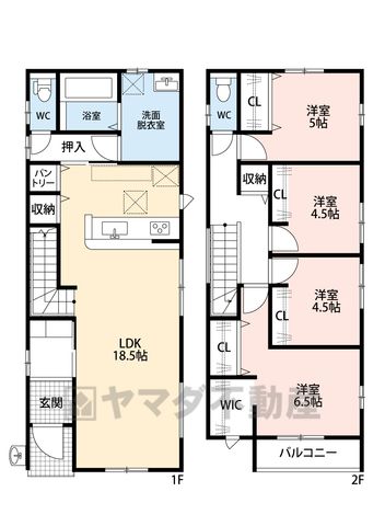 LDK18.5畳(1F)、洋6.5畳(2F)、洋5畳(2F)、洋4.5畳(2F) |
