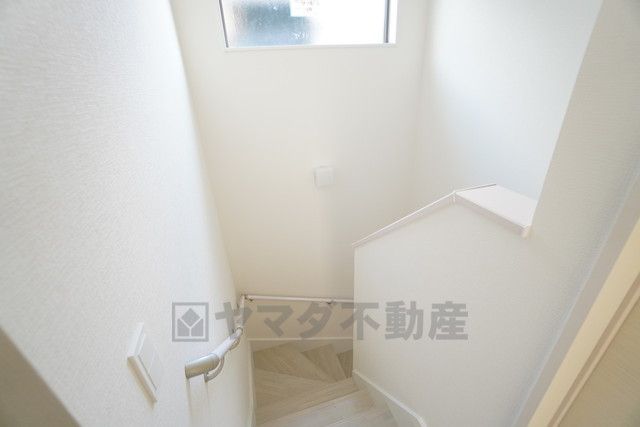 お子様も高齢の方も安心して上り下りができる手摺がついた安心設計です。 階段には小窓を配置しました。日中でも暗くなりがちな階段下が明るくなり安全ですね。