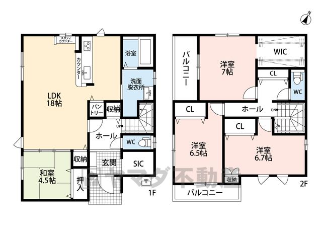 LDK18畳(1F)、和4.5畳(1F)、洋7畳(2F)、洋6.7畳(2F)、洋6.5畳(2F) |