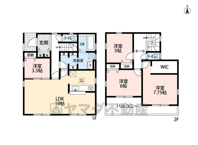 LDK18畳(1F)、洋3.5畳(1F)、洋7.7畳(2F)、洋6畳(2F)、洋5畳(2F) |