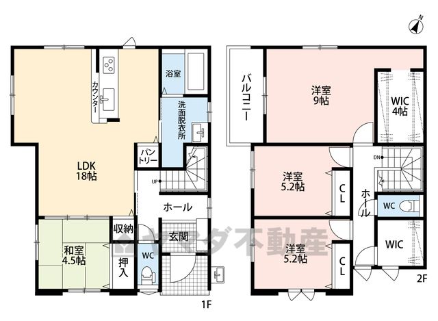 LDK18畳(1F)、和4.5畳(1F)、洋9畳(2F)、洋5.2畳(2F) |
