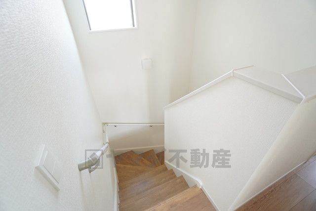 お子様も高齢の方も安心して上り下りができる手摺がついた安心設計です。 階段には小窓を配置しました。日中でも暗くなりがちな階段下が明るくなり安全ですね。