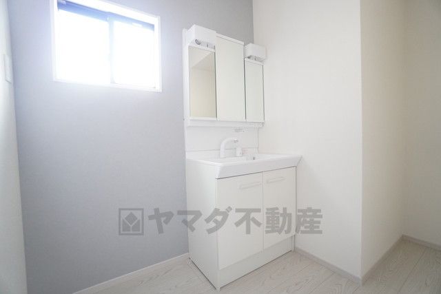 三面鏡裏収納付き洗面化粧台です^^ 歯磨きセットやスキンケア用品などの収納に便利ですね。 生活感も隠すことができ、来客時にも安心です。