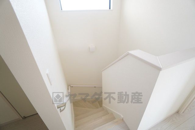 お子様も高齢の方も安心して上り下りができる手摺がついた安心設計です。 階段には小窓を配置しました。日中でも暗くなりがちな階段下が明るくなり安全ですね。