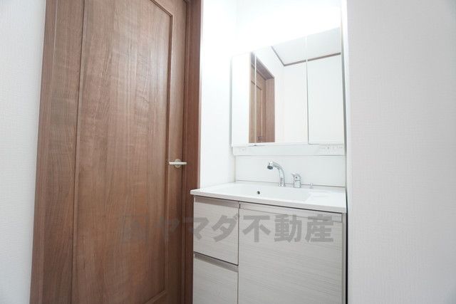 三面鏡裏収納付き洗面化粧台です^^ 歯磨きセットやスキンケア用品などの収納に便利ですね。