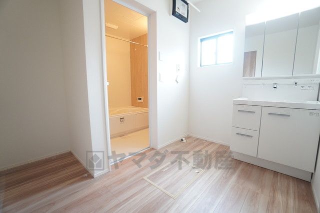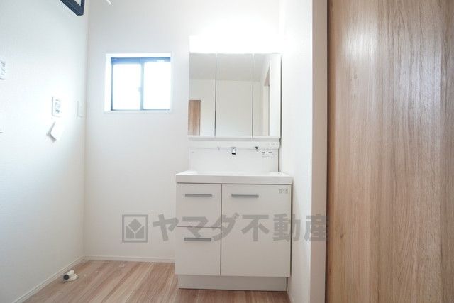 三面鏡裏収納付き洗面化粧台です^^ 歯磨きセットやスキンケア用品などの収納に便利ですね。 ランドリースペース上部には窓も付いており換気に便利です^^