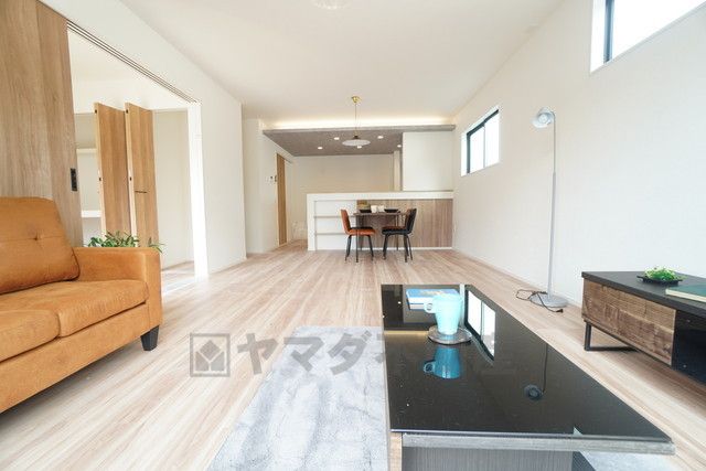 19.5帖。家族が集まる開放的なリビング。思い思いの時間を過ごしたり食事をしたり、素敵な団らんの場になりますね。
