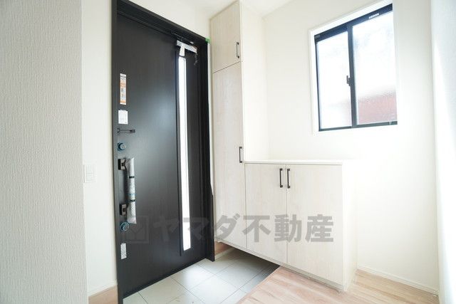 採光も考えられた明るい玄関です。シューズボックス付きなので、家族全員の靴がきれいに整頓できます。 向かいにシューズクロークもあります^^ベビーカーやゴルフバッグなどもしっかり収納できます^^
