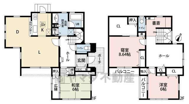 LDK0畳(1F)、和6畳(1F)、洋8.6畳(2F)、洋6畳(2F) |