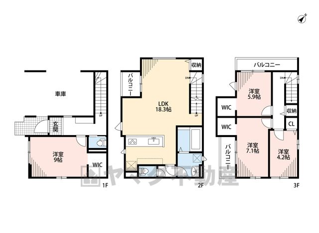 LDK18.3畳(2F)、洋9畳(1F)、洋7.1畳(3F)、洋5.9畳(3F)、洋4.2畳(3F) |