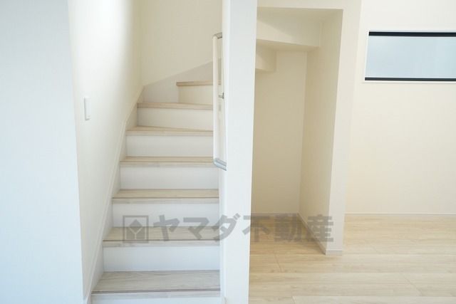 お子様も高齢の方も安心して上り下りができる手摺がついた安心設計です。 階段には小窓を配置しました。日中でも暗くなりがちな階段下が明るくなり安全ですね。