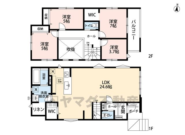 LDK24.6畳(1F)、洋7畳(2F)、洋5畳(2F)、洋3.7畳(2F) |