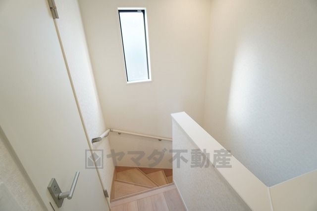 お子様も高齢の方も安心して上り下りができる手摺がついた安心設計です。 階段には小窓を配置しました。日中でも暗くなりがちな階段下が明るくなり安全ですね。