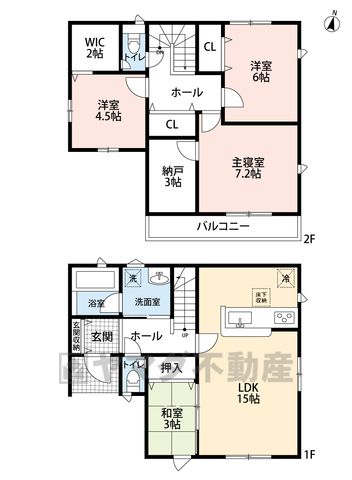 LDK15畳(1F)、和3畳(1F)、洋7.2畳(2F)、洋6畳(2F)、洋4.5畳(2F)、S3畳(2F) |