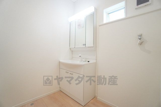 三面鏡裏収納付き洗面化粧台です^^ 歯磨きセットやスキンケア用品などの収納に便利ですね。 生活感も隠すことができ、来客時にも安心です。
