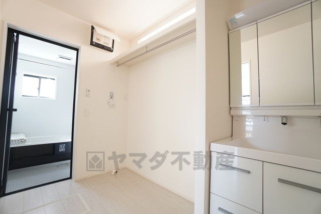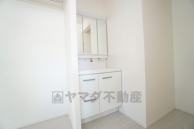 三面鏡裏収納付き洗面化粧台です^^ 歯磨きセットやスキンケア用品などの収納に便利ですね。 生活感も隠すことができ、来客時にも安心です。