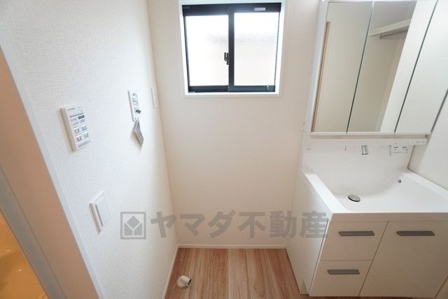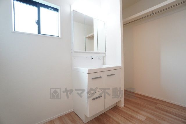 三面鏡裏収納付き洗面化粧台です^^ 歯磨きセットやスキンケア用品などの収納に便利ですね。 生活感も隠すことができ、来客時にも安心です。