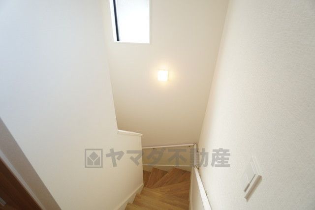 お子様も高齢の方も安心して上り下りができる手摺がついた安心設計です。 階段には小窓を配置しました。日中でも暗くなりがちな階段下が明るくなり安全ですね。