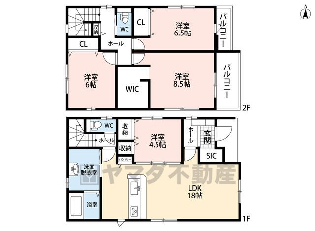 LDK18畳(1F)、洋4.5畳(1F)、洋6畳(2F)、洋6.5畳(2F)、洋8.5畳(2F) |
