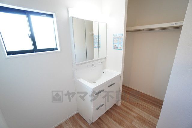 三面鏡裏収納付き洗面化粧台です^^ 歯磨きセットやスキンケア用品などの収納に便利ですね。