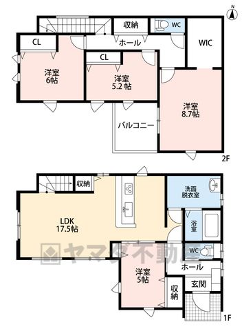 LDK17.5畳(1F)、洋5畳(1F)、洋8.7畳(2F)、洋6畳(2F)、洋5.2畳(2F) |