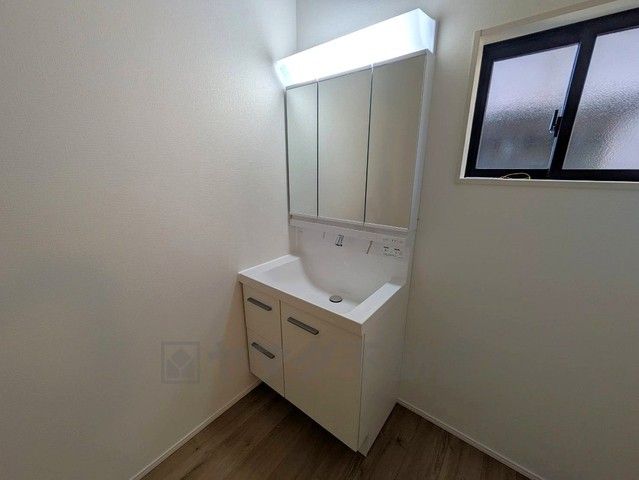 三面鏡裏収納付き洗面化粧台です^^ 歯磨きセットやスキンケア用品などの収納に便利ですね。 生活感も隠すことができ、来客時にも安心です。