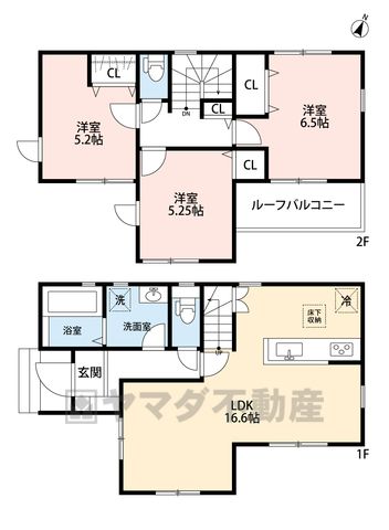 LDK16.6畳(1F)、洋6.5畳(2F)、洋5.2畳(2F)、洋5.2畳(2F) |