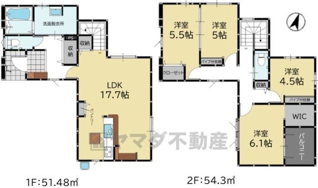 LDK17.7畳(1F)、洋6.1畳(2F)、洋5.5畳(2F)、洋5畳(2F)、洋4.5畳(2F) |