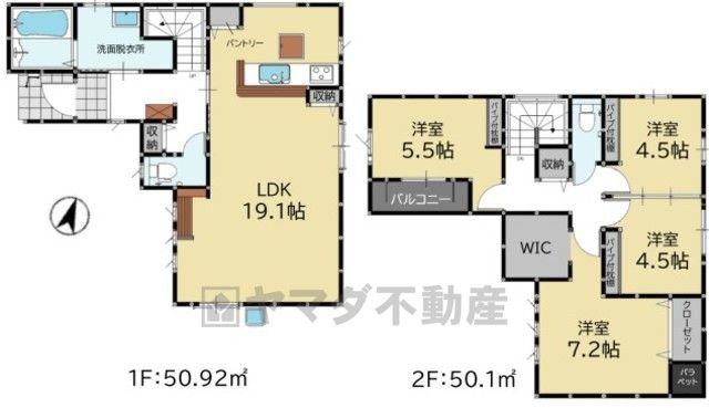LDK19.1畳(1F)、洋7.2畳(2F)、洋5.5畳(2F)、洋4.5畳(2F) |