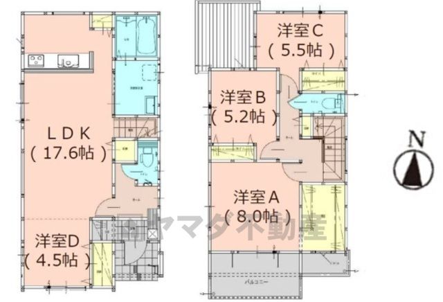 LDK17.6畳(1F)、洋4.5畳(1F)、洋8畳(2F)、洋5.5畳(2F)、洋5.2畳(2F) |