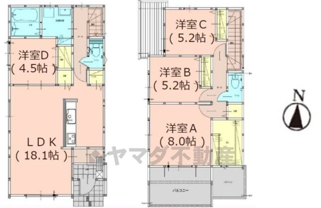 LDK18.1畳(1F)、洋4.5畳(1F)、洋8畳(2F)、洋5.5畳(2F)、洋5.2畳(2F) |